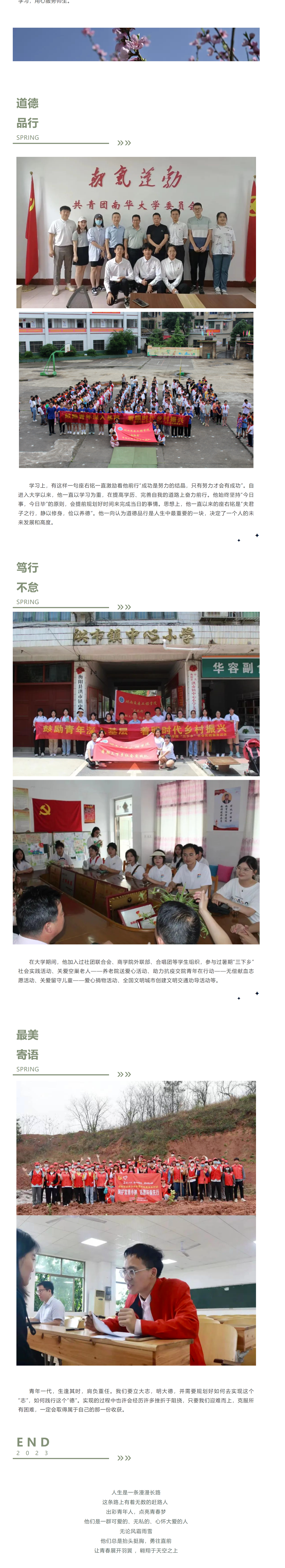 青春的路上,少年背着行囊, 踏上旅途风华正茂 , 满腔热血带着温暖。  带着爱意用实际行动感染身边的人,用充满善意的心呵护身边的一点一滴。他就是最美大学生“道德风尚奖”及“芙蓉学子”获得者—谢卫东