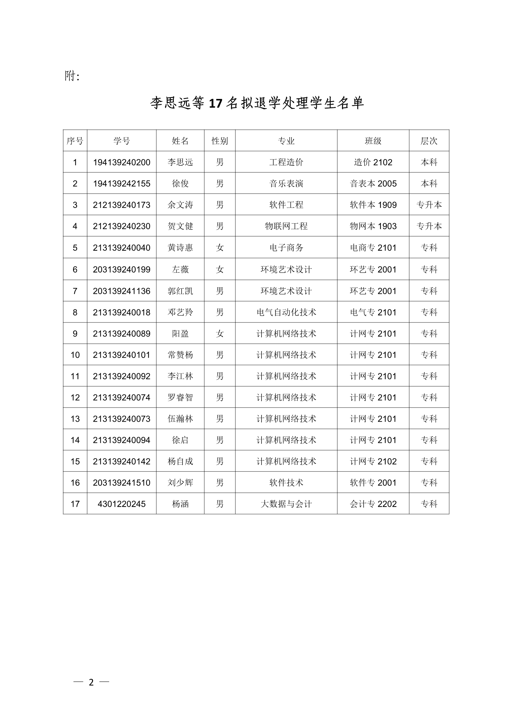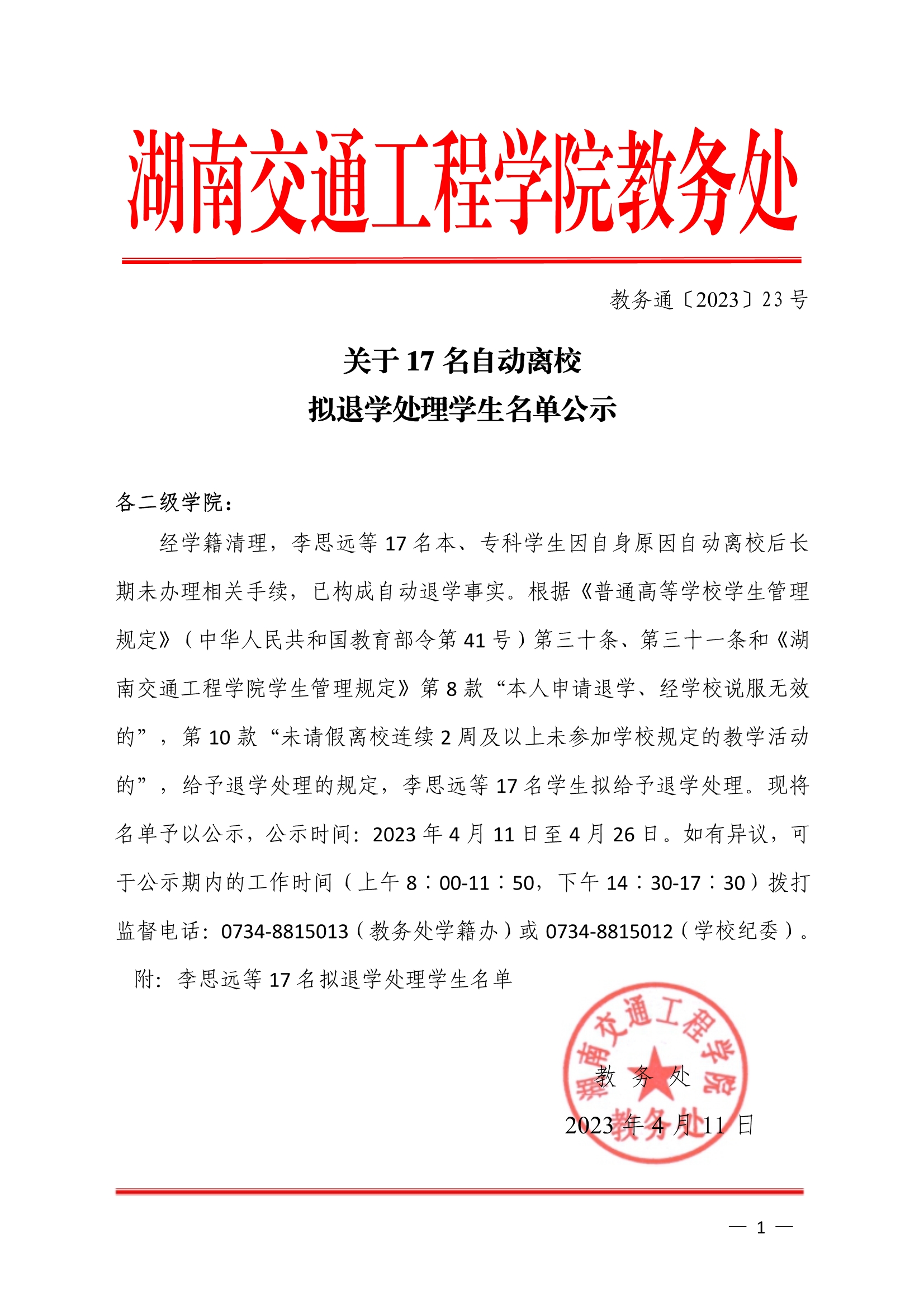关于17名自动离校拟退学处理学生名单公示