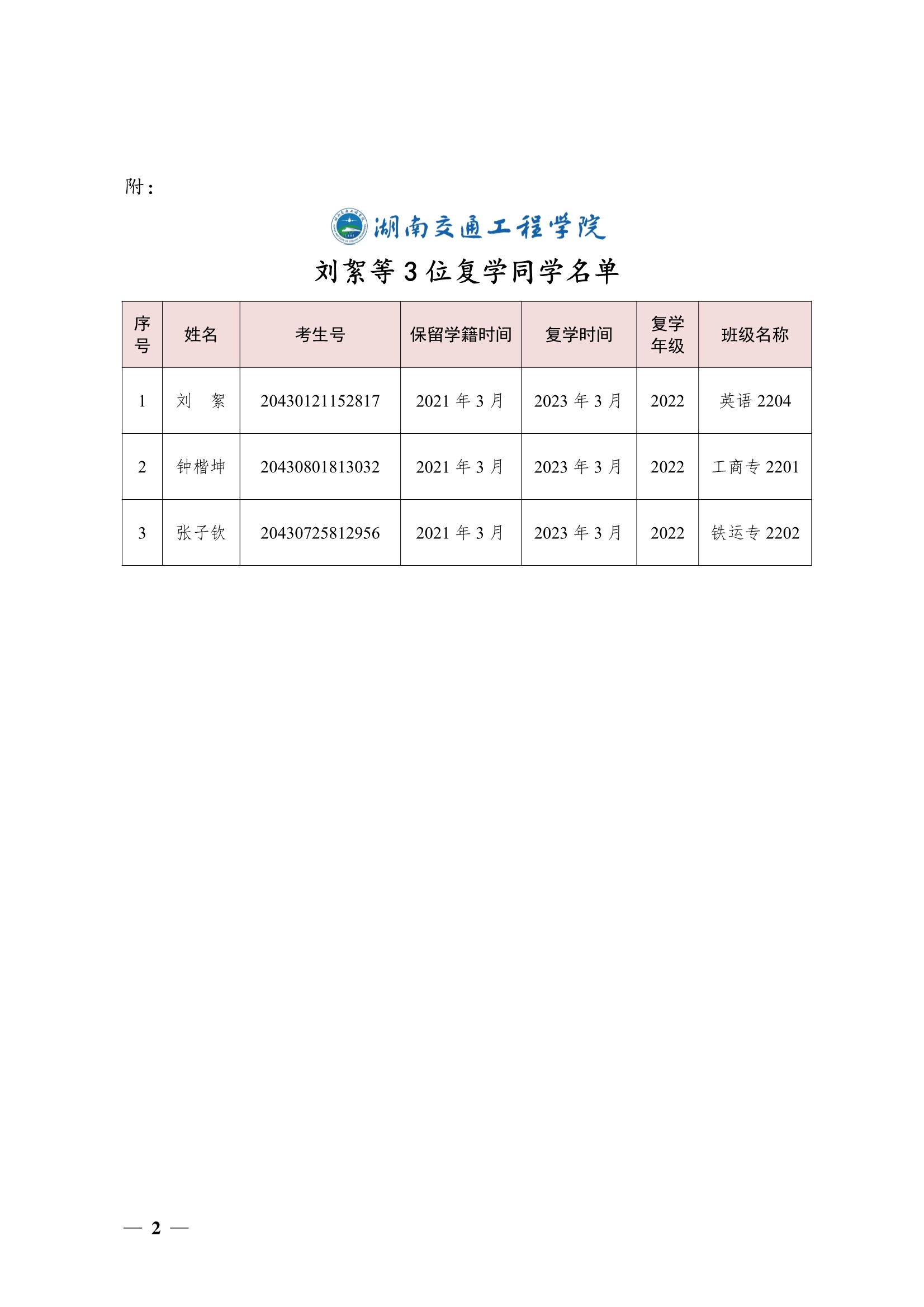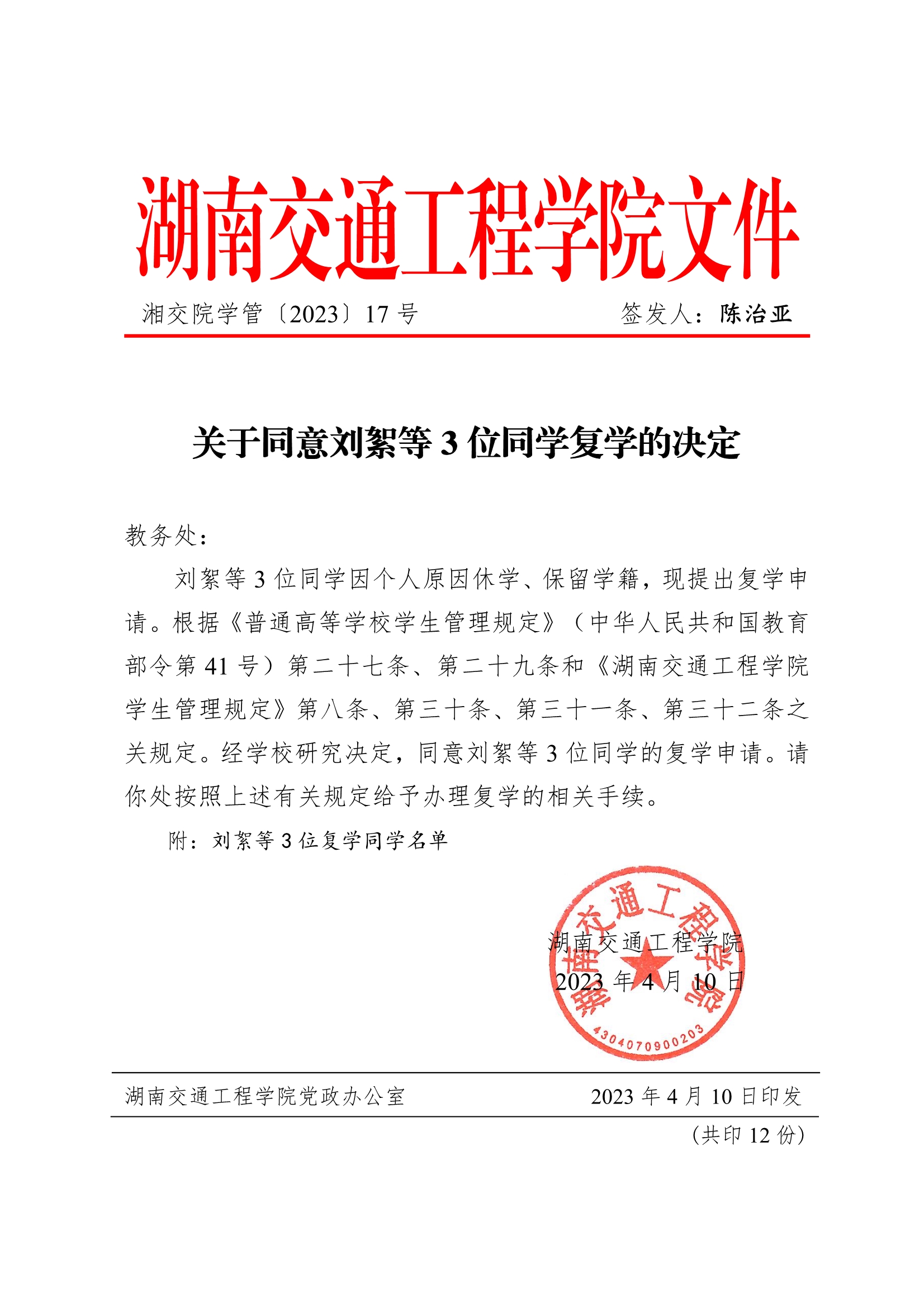 关于同意刘絮等3位同学复学的决定(湘交院学管〔2023〕17号)