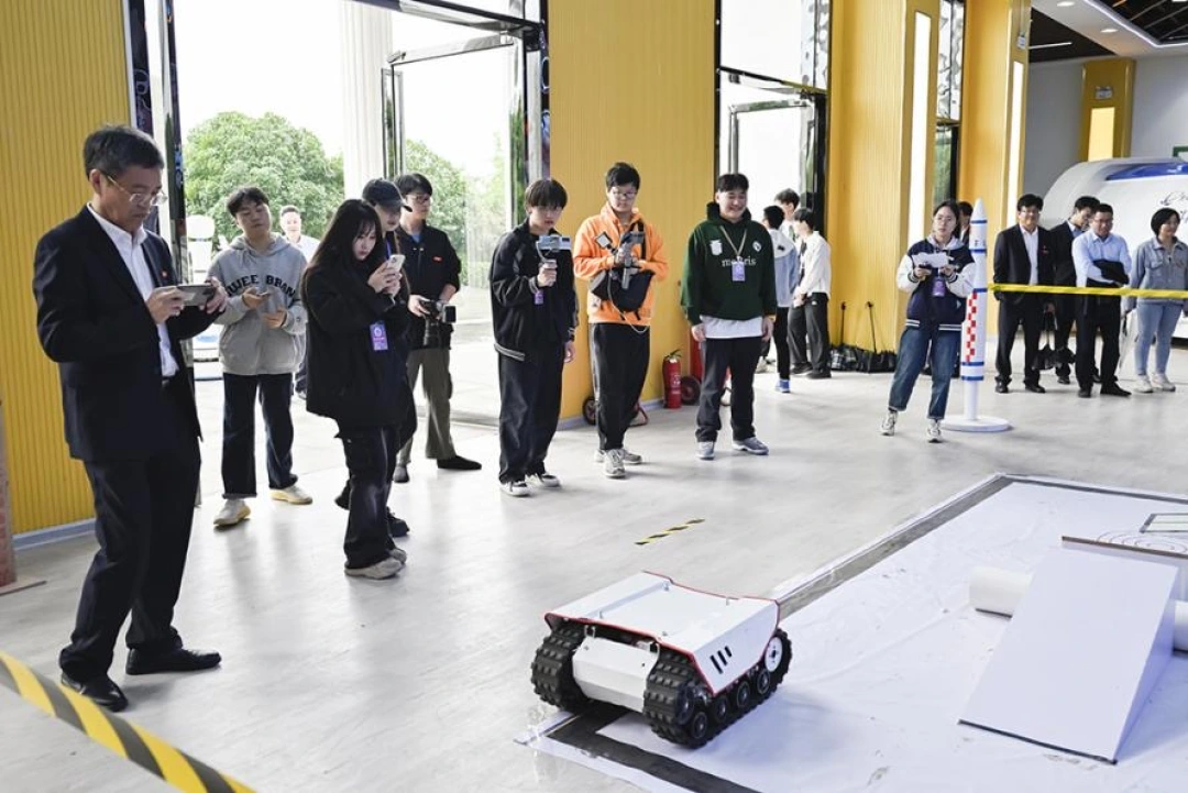 成果展示环节,科技展品琳琅满目,现场演示了编队无人机飞行表演,无人机物料抓取与投放表演,仿生机械狗动作、舞蹈表演,变胞机器人舞蹈表演,蛇形机器人表演,机器人和无人机智能配送,3D 打印、激光切割和激光内雕作品,3D 打印机和光固化打印机作品打印过程打印,履带坦克机器人现场作业等,令现场观摩的大学生拍案叫绝。