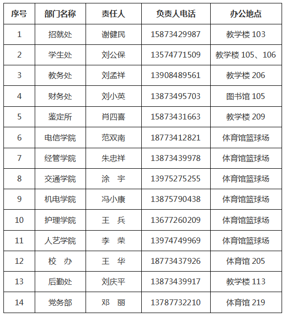 四、各部门办公地点及责任人电话