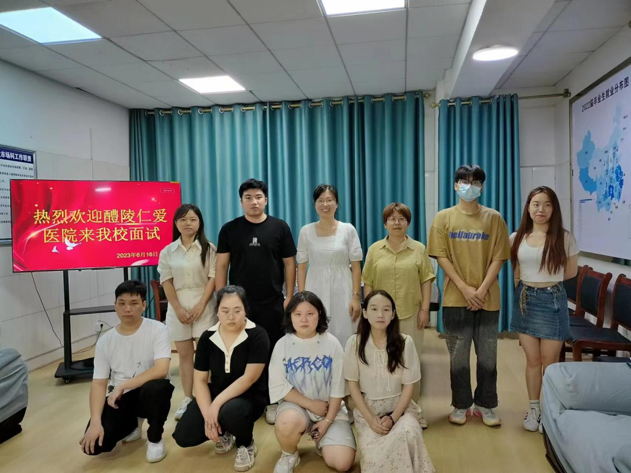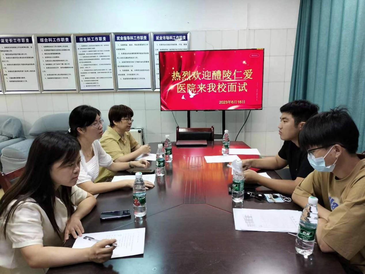6月16日,湖南省醴陵市仁爱医院廖意钢主任一行3人,到我院举行2023届毕业生校园招聘会。本次会议线上线下同步进行,医学技术与护理学院党总支书记邓丽,学生干事老师陈文蓉、辅导员周艳平参加会议。