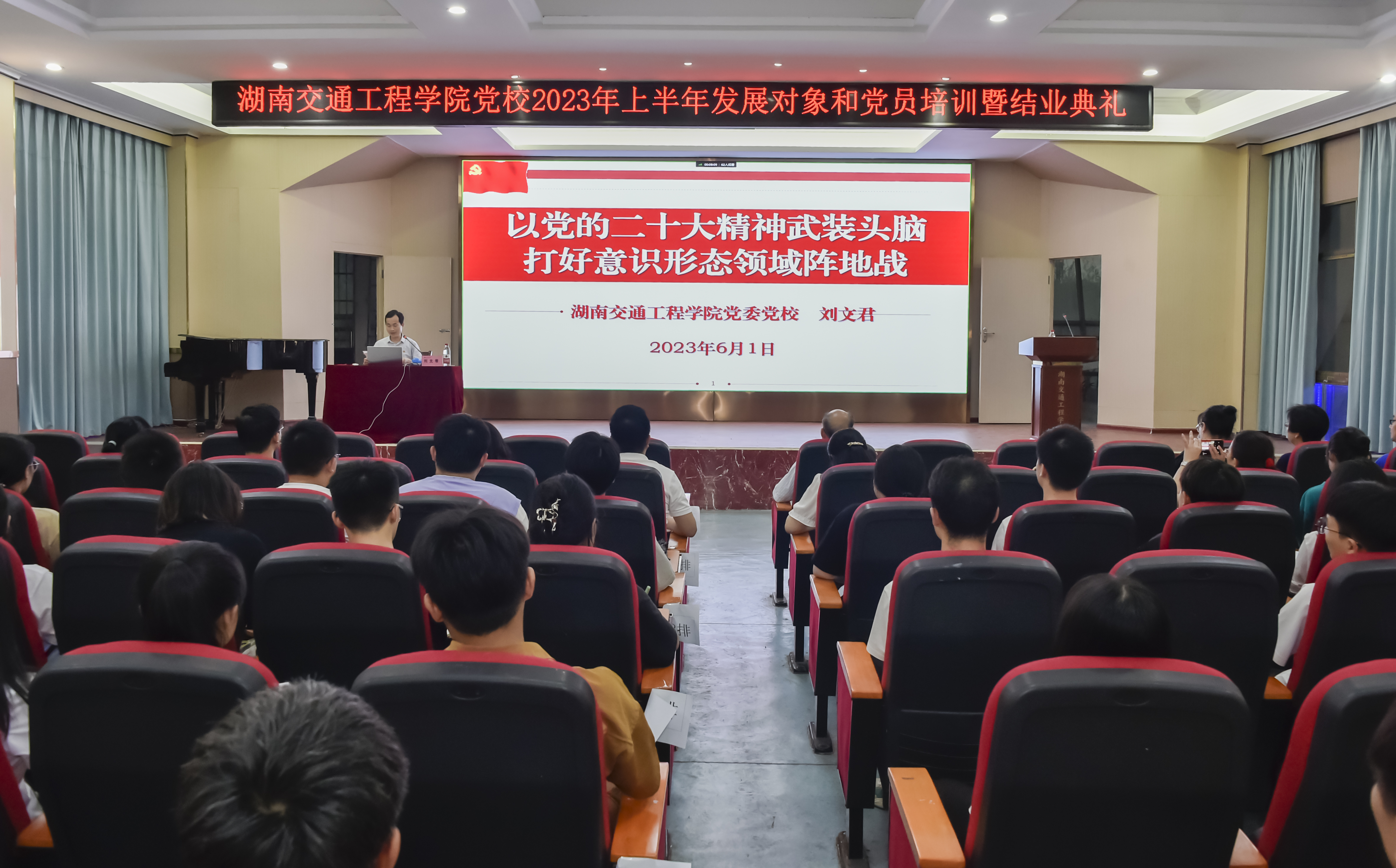 党课上,该校党委书记刘文君以《以党的二十大精神武装头脑 打好意识形态领域阵地战》为题,用精巧的设计、精美的课件、丰富的素材、经典的案例,结合国内国际形势,从“千奇百怪怎么看”“斗争态势怎么判”“敌人正在怎么干”“我们应该怎么办”四个方面,抓住“意识形态”的问题本质、整体形势、解决思路、注意事项及相关启示进⾏深入浅出的阐述,期间穿插课堂互动、答疑解惑,气氛活跃。