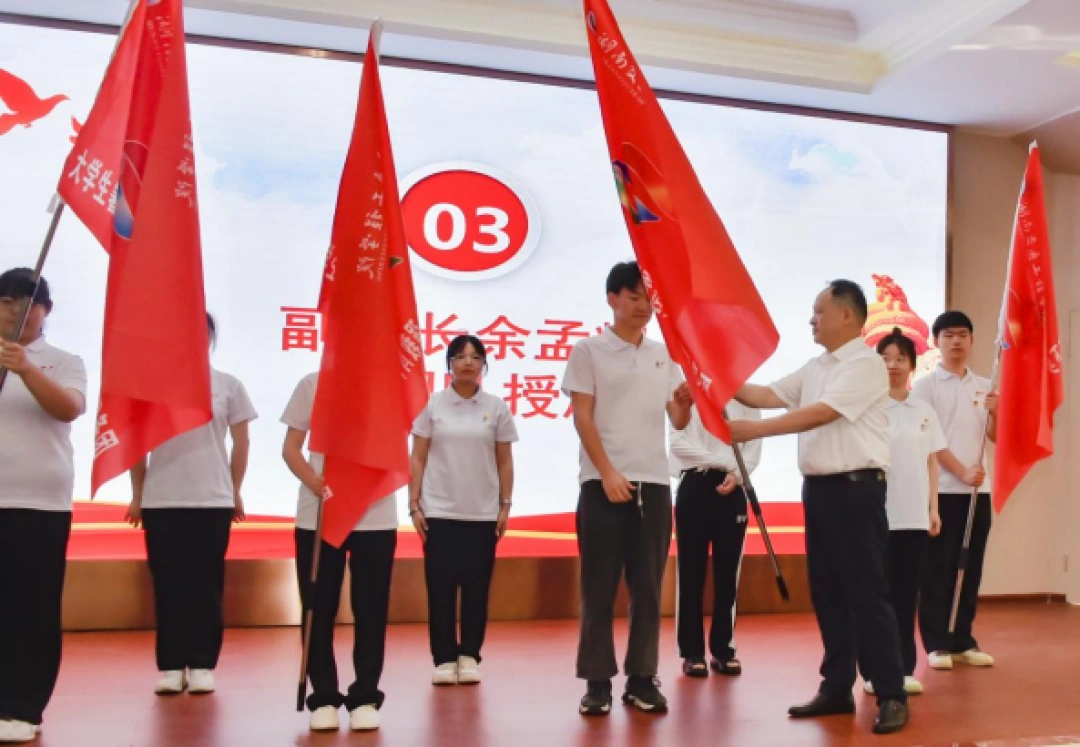 余孟辉给7支“三下乡”社会实践团队分别授旗并提出希望和要求。漆在林介绍了本次社会实践活动的总体情况并宣布学校本年度大学生暑期“三下乡”社会实践团队正式出征。全体志愿者在仪式上进行了出征宣誓。