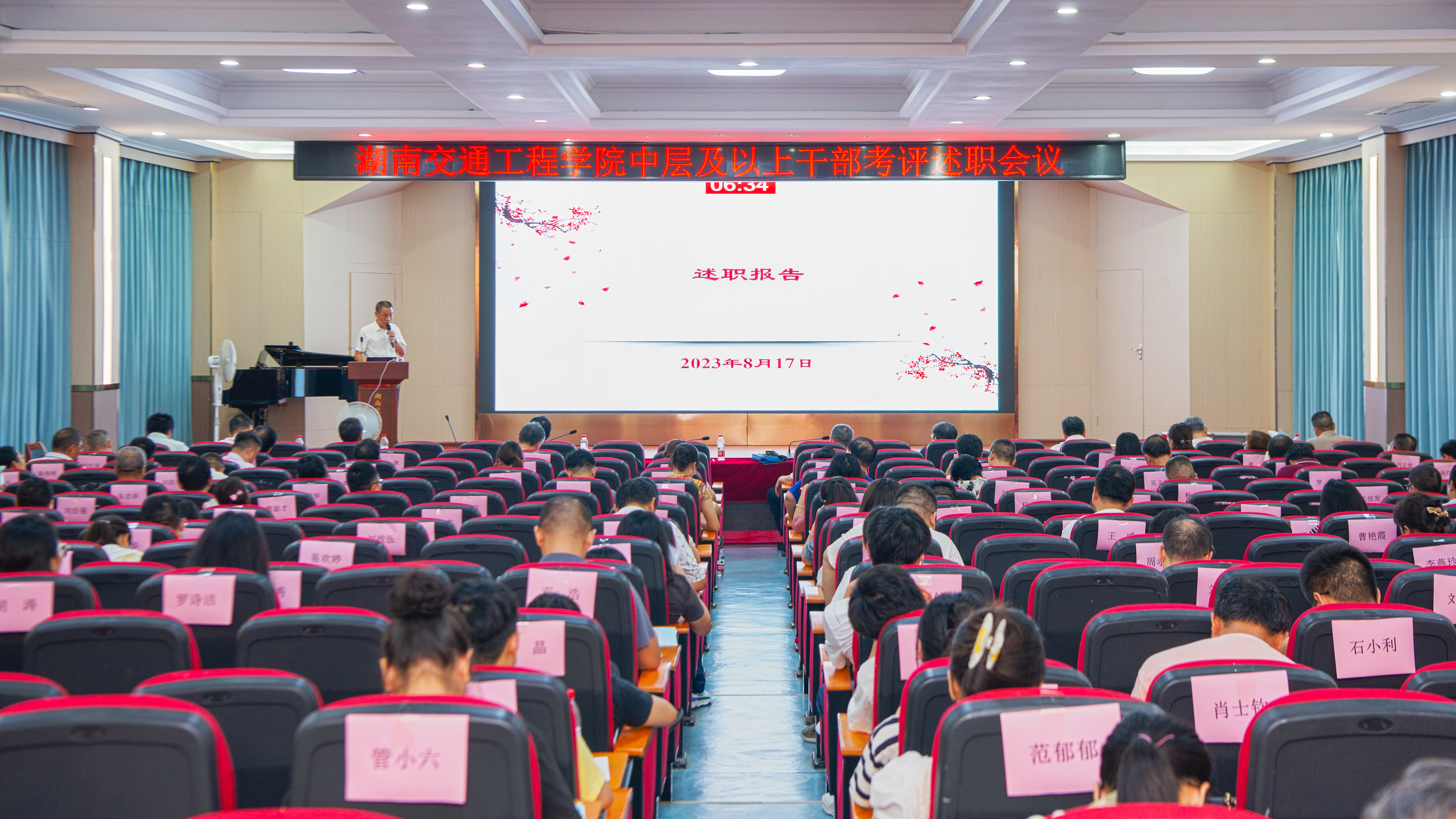 本网讯(记者 赵红深 摄影  奉隆源8月17日上午,学校在航母楼101会议室举行2022-2023学年中层及以上管理人员述职考核测评大会,校董事会成员,校领导,校机关(含附属)单位正副职干部,二级教学科研单位正副职干部,各教研室主任和教师代表等160余人参加了会议。会议由副董事长、执行校长刘杰主持。