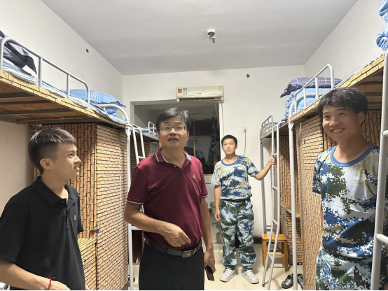 为全面了解2023级新生大学军训适应情况,帮助2023级新生更快地适应大学生活,切实加强师生交流,机电工程学院党总支书记罗斐和辅导员何立权于2023年9月9日晚10点深入机电工程学院新生所在的10栋宿舍走访看望新生,与新生们展开了亲切的交谈,并了解新生们的入住情况和感受。