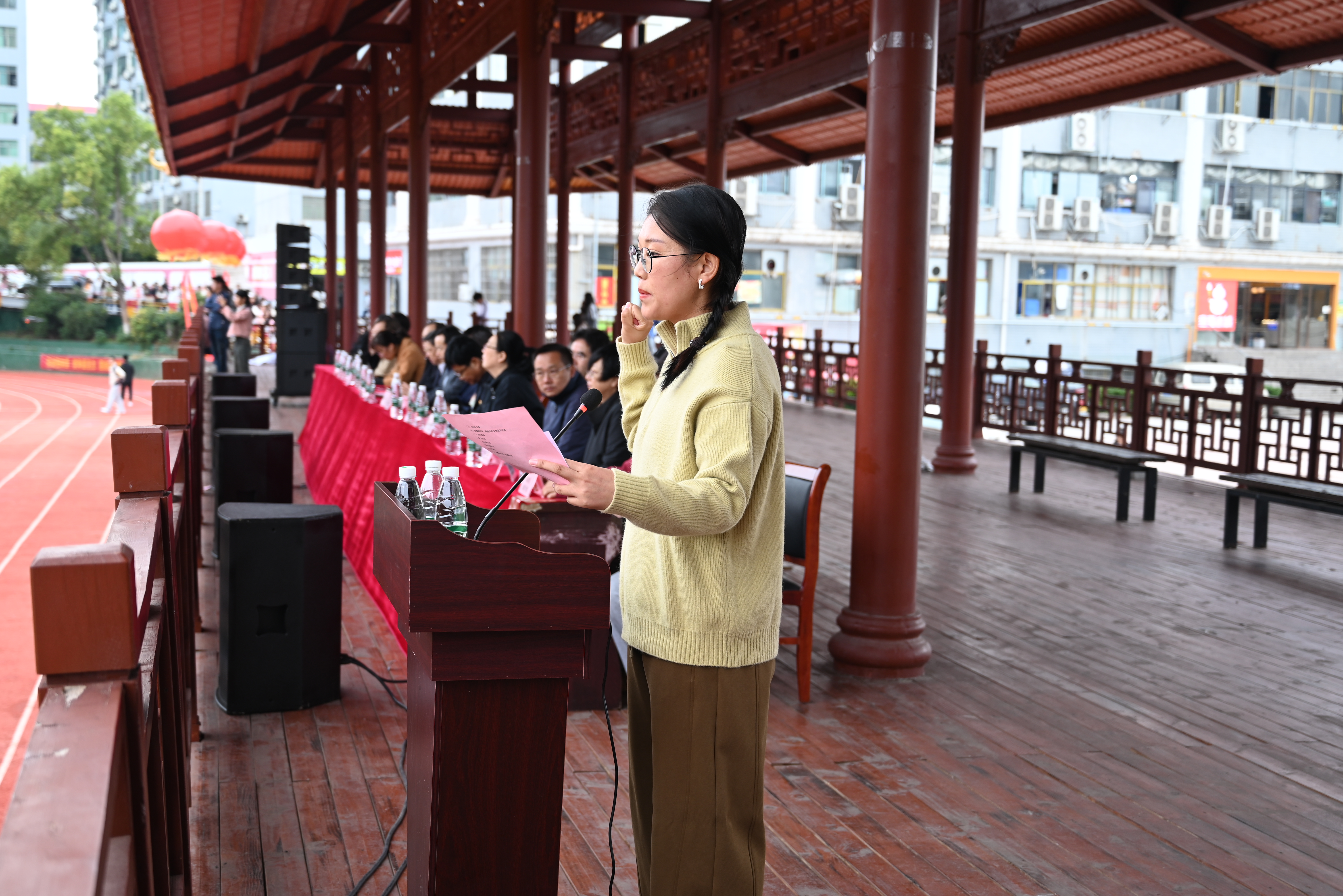 雄壮嘹亮的国歌声响起,师生合唱,响彻校园。党委书记刘文君致开幕辞。他指出,每天锻炼一小时,健康工作五十年,幸福生活一辈子。学校高度重视体育教学和体育运动,把“一切为了学生的健康”作为体育工作的出发点和归宿点。引导学生养成良好的运动习惯,掌握基本的运动技能,享受运动带来的健康快乐,锤炼意志品质,促进全面发展。希望运动员们以饱满的热情、昂扬的斗志、勇于拼搏的精神参加各项赛事,比思想、比作风、比纪律、比竞技,赛出水平,赛出风格,赛出学校精神;全体裁判员认真履职、秉公执裁;全体工作人员各司其职、保障安全,为各项比赛的顺利进行提供有力保证。