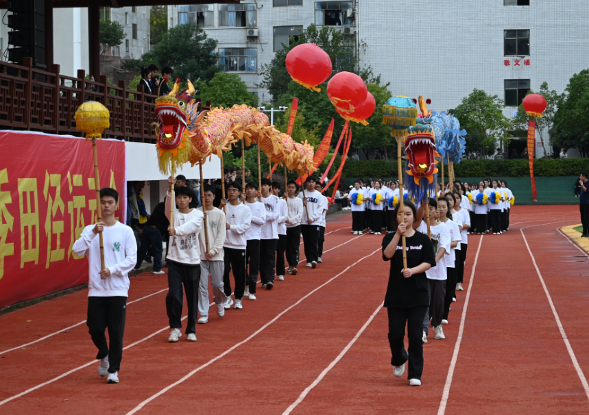 伴随着激昂的音乐,响起了激情飞扬的入场介绍开始了入场式。学校国旗护卫队护卫着神圣而鲜艳的国旗率先向主席台走来,他们昂首阔步,代表着祖国的未来和希望。校徽方队、校训方队、彩旗方队、鲜花方队、舞龙方队、啦啦操方队、老兵连方队、社团方队、艺术表演方队、裁判员方队、运动员方队紧随其后,各二级学院特色方队依次入场。各方阵走过主席台接受领导、观众们的检阅时,均创意迭出展现了别样的风采。有的装扮成萌萌的熊本熊、狐狸尼克、兔子朱迪等知名动漫人物形象参与其中,有的跳起欢快的舞步。有趣的人偶与欢快的热舞牢牢吸引住了观众目光。他们的才艺展示精彩纷呈,成为赛场上一道亮丽的风景线。伴着铿锵的节奏,迈着矫健的步伐,高喊高亢嘹亮的口号,运动员们精神抖擞、蓄势待发,他们自信与骄傲的姿态,仿佛在告诉我们:“这就是交院人,这就是交院学生团结向上、斗志昂扬的良好精神风貌。观众席上热情高涨,纷纷为各队的精彩亮相鼓掌喝彩。