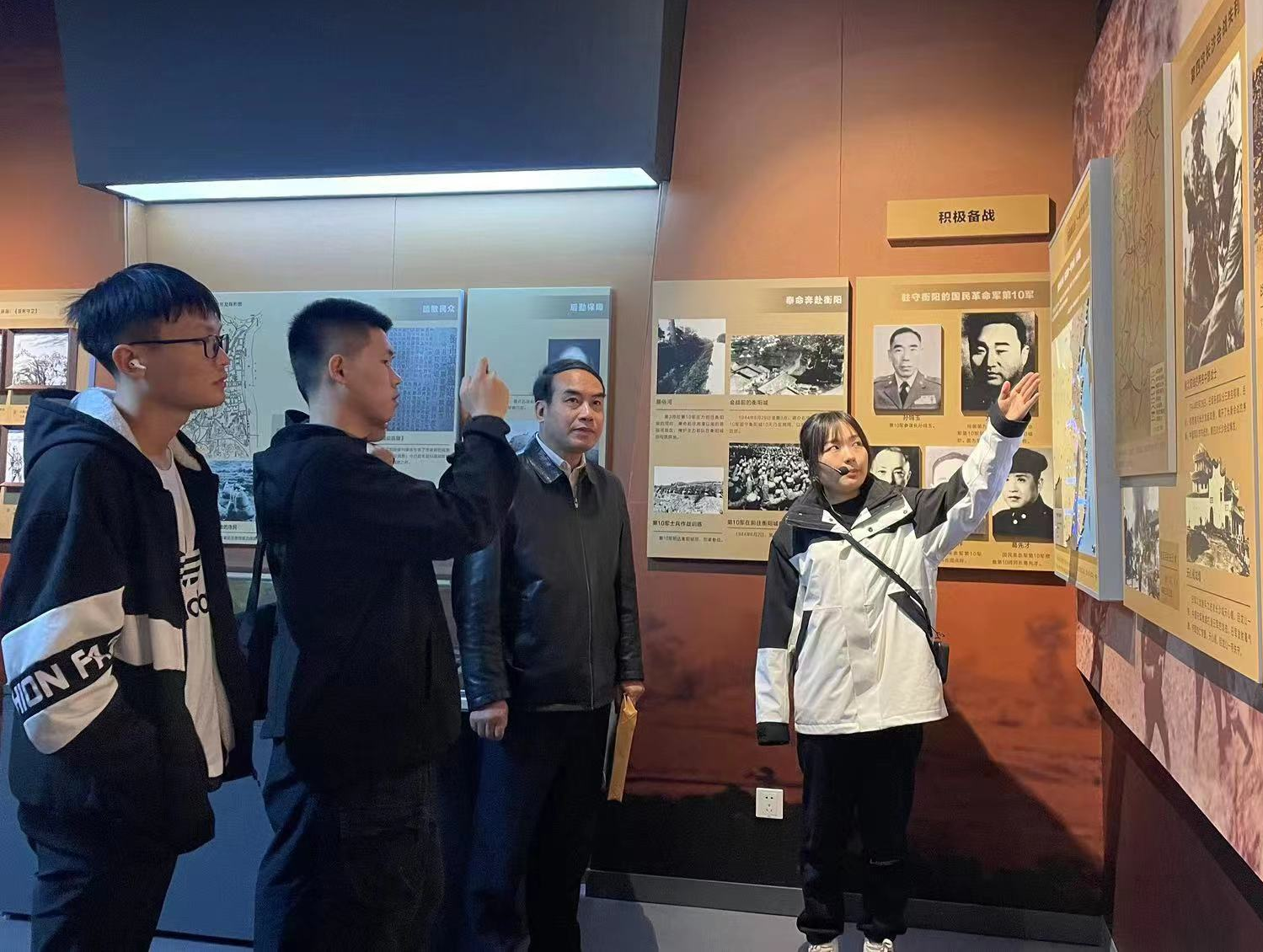 本网讯(通讯员 沈飚)为深入探寻伟大抗战精神的内核,促进对伟大抗战精神内涵的认识、弘扬和发展,引导大学生在慎终追远、缅怀英烈的情怀中更好地赓续伟大抗战精神。近日,马克思主义学院副院长沈飚组织机电工程学院学生代表在衡阳抗战纪念馆开展“铭记历史、缅怀先烈,传承赓续伟大抗战精神”大学生主题思政课系列实践教学活动。