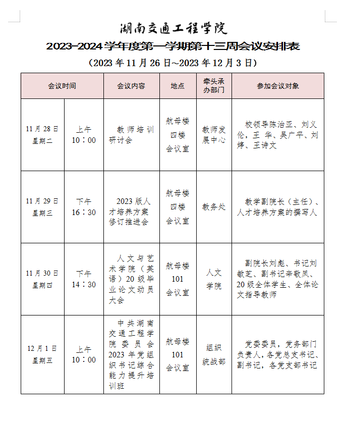 best365中国官方网站 2023-2024学年度第一学期第十四周会议安排表