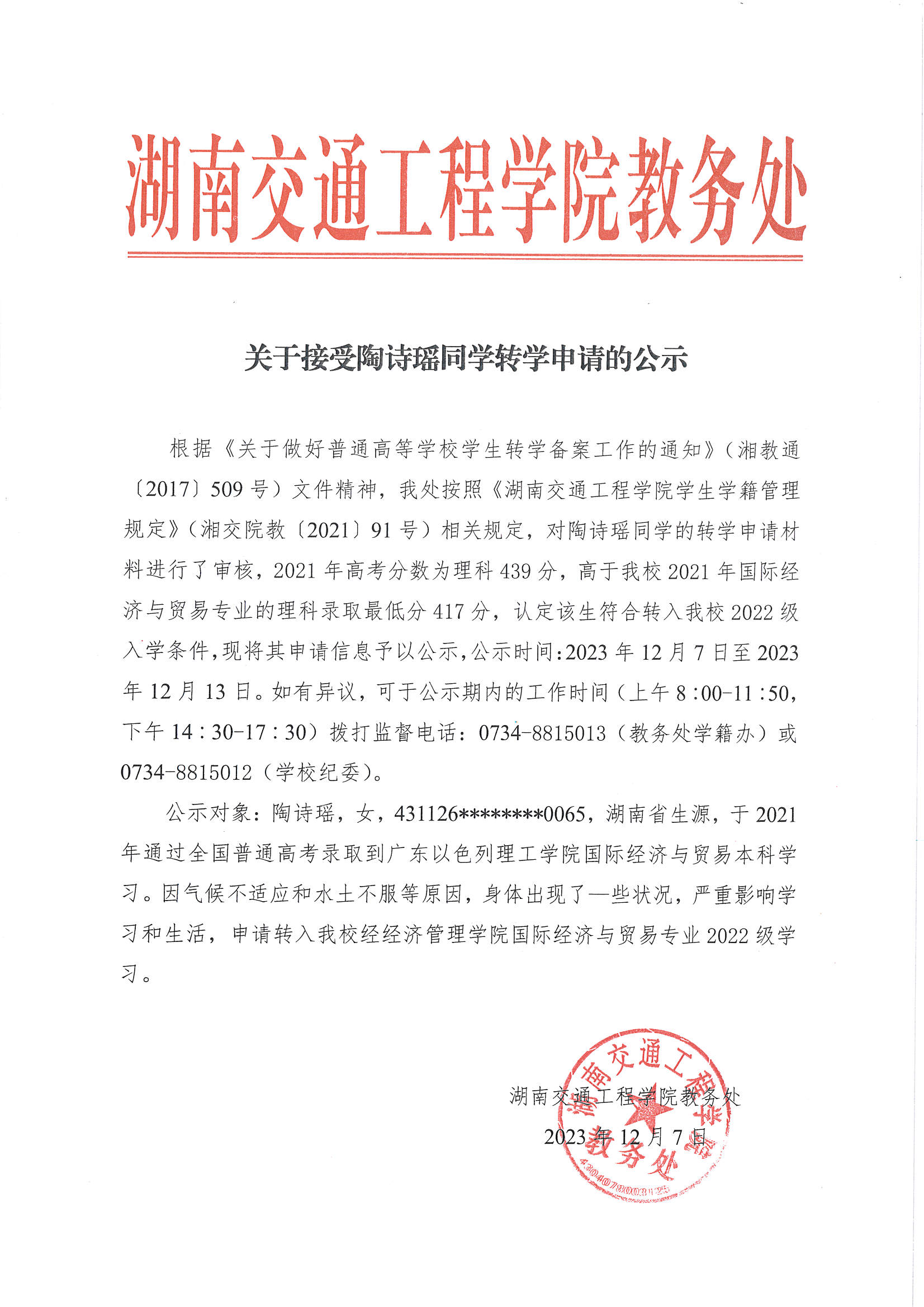 关于接受陶诗瑶同学转学申请的公示