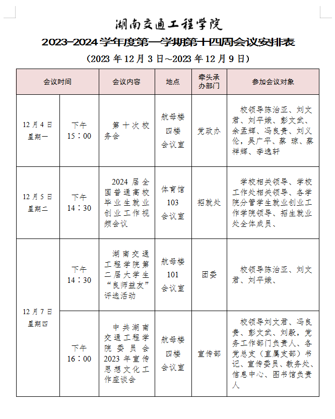 best365中国官方网站 2023-2024学年度第一学期第十四周会议安排表