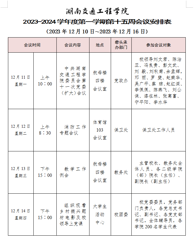 best365中国官方网站 2023-2024学年度第一学期第十四周会议安排表