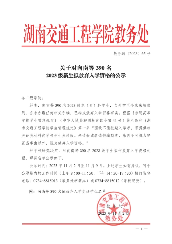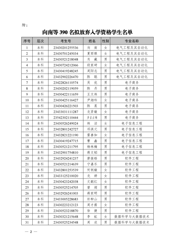 关于对向南等390名2023级新生拟放弃入学资格的公示