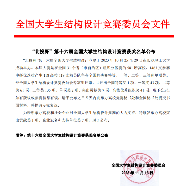 (转发)“北投杯”第十六届全国大学生结构设计竞赛获奖名单公布