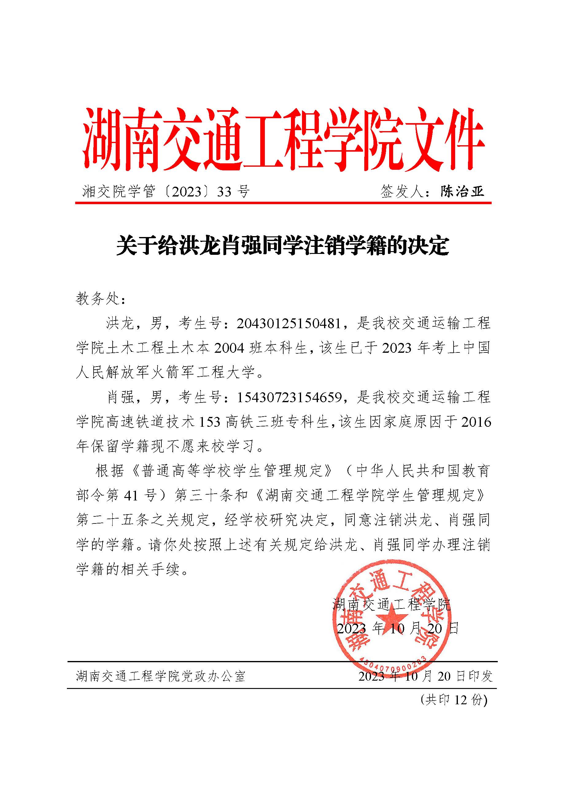 关于给洪龙、肖强同学注销学籍的决定(湘交院学管〔2023〕33号)