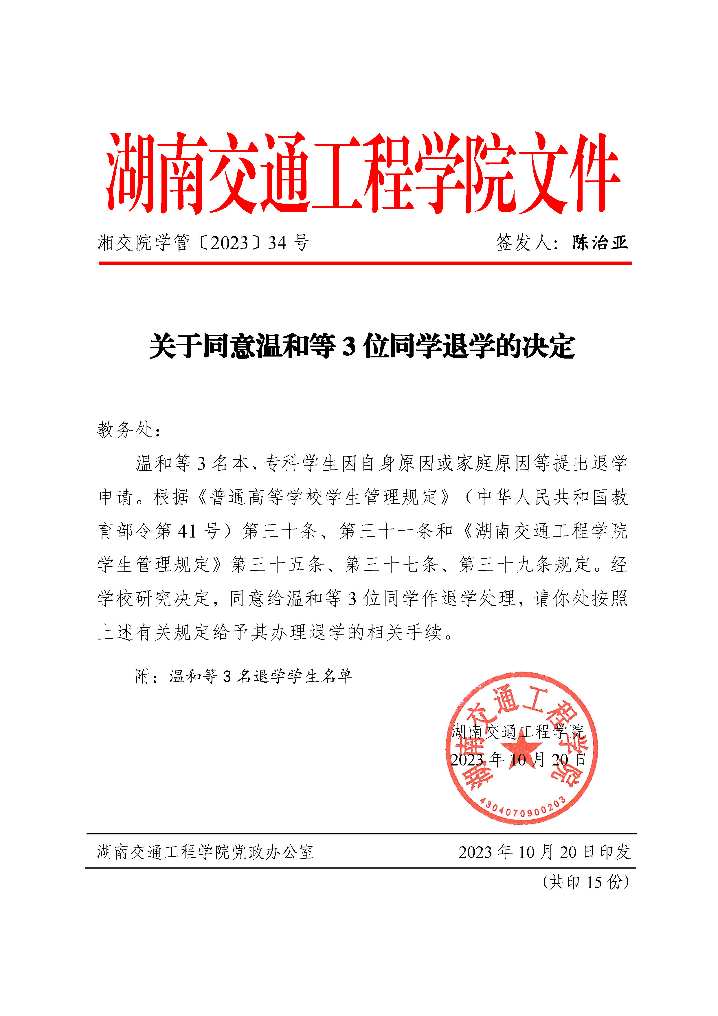 关于同意温和等3位同学退学的决定(湘交院学管〔2023〕34号)