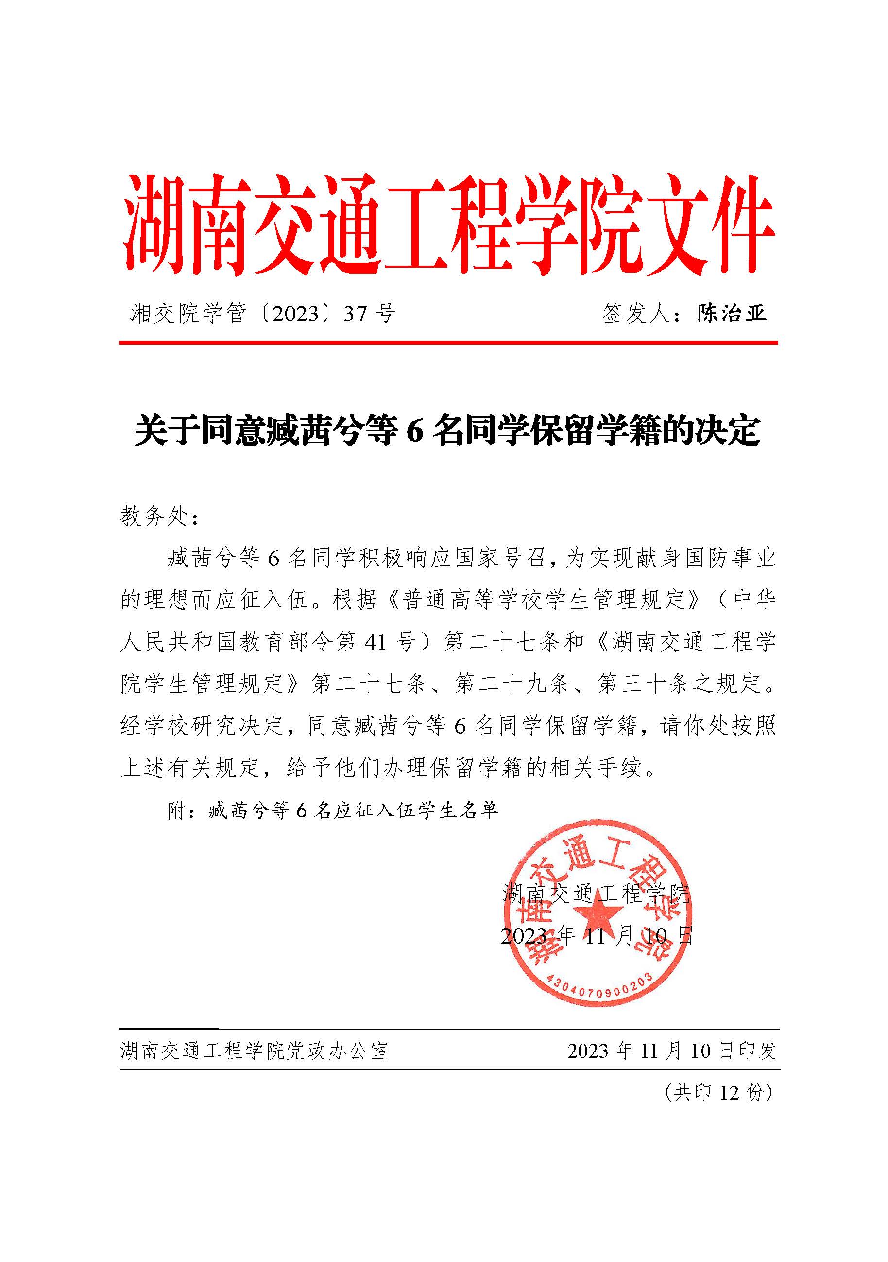 关于同意臧茜兮等6名同学保留学籍的决定(湘交院学管〔2023〕37号)