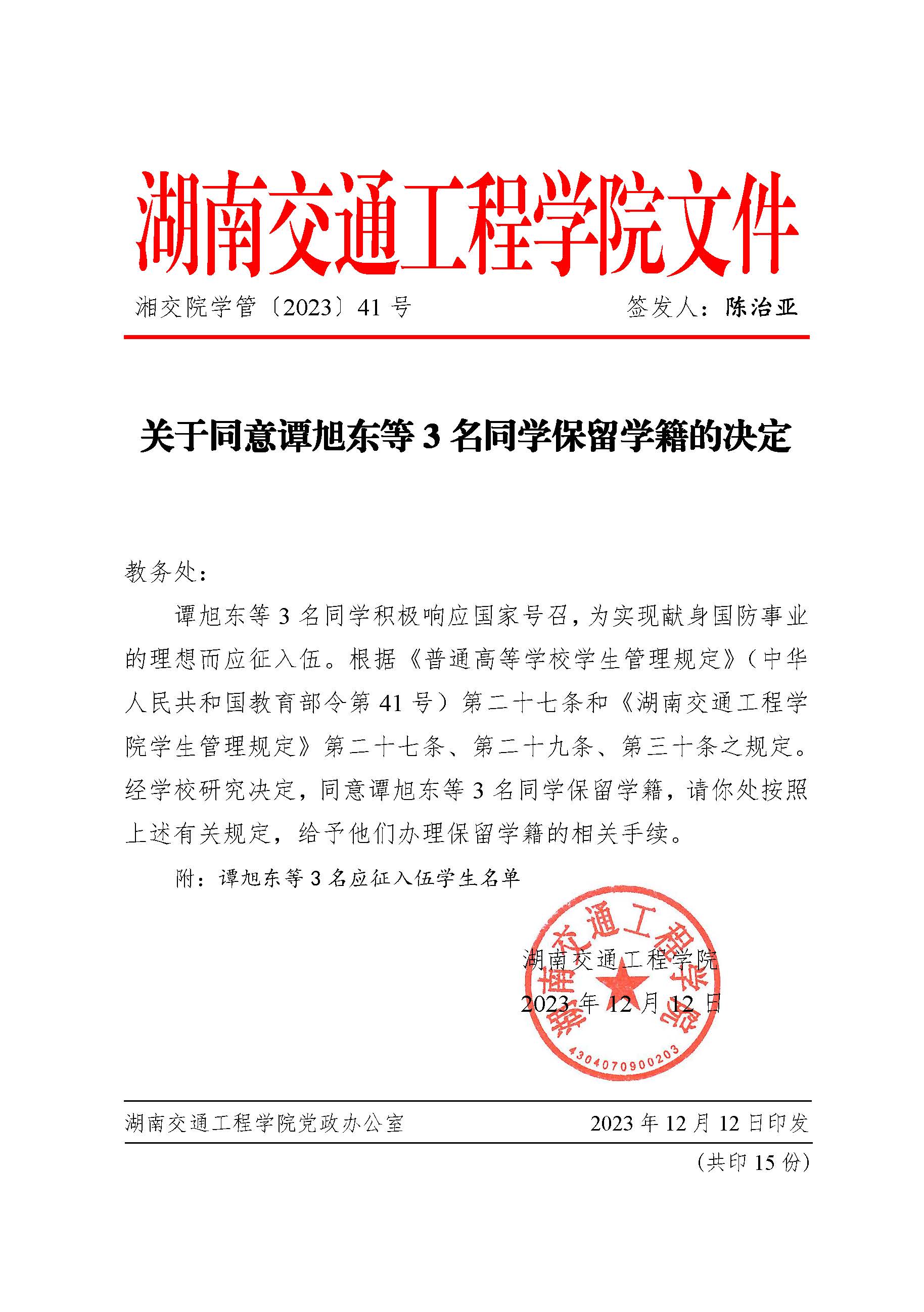 关于同意谭旭东等3名同学保留学籍的决定(湘交院学管〔2023〕41号)