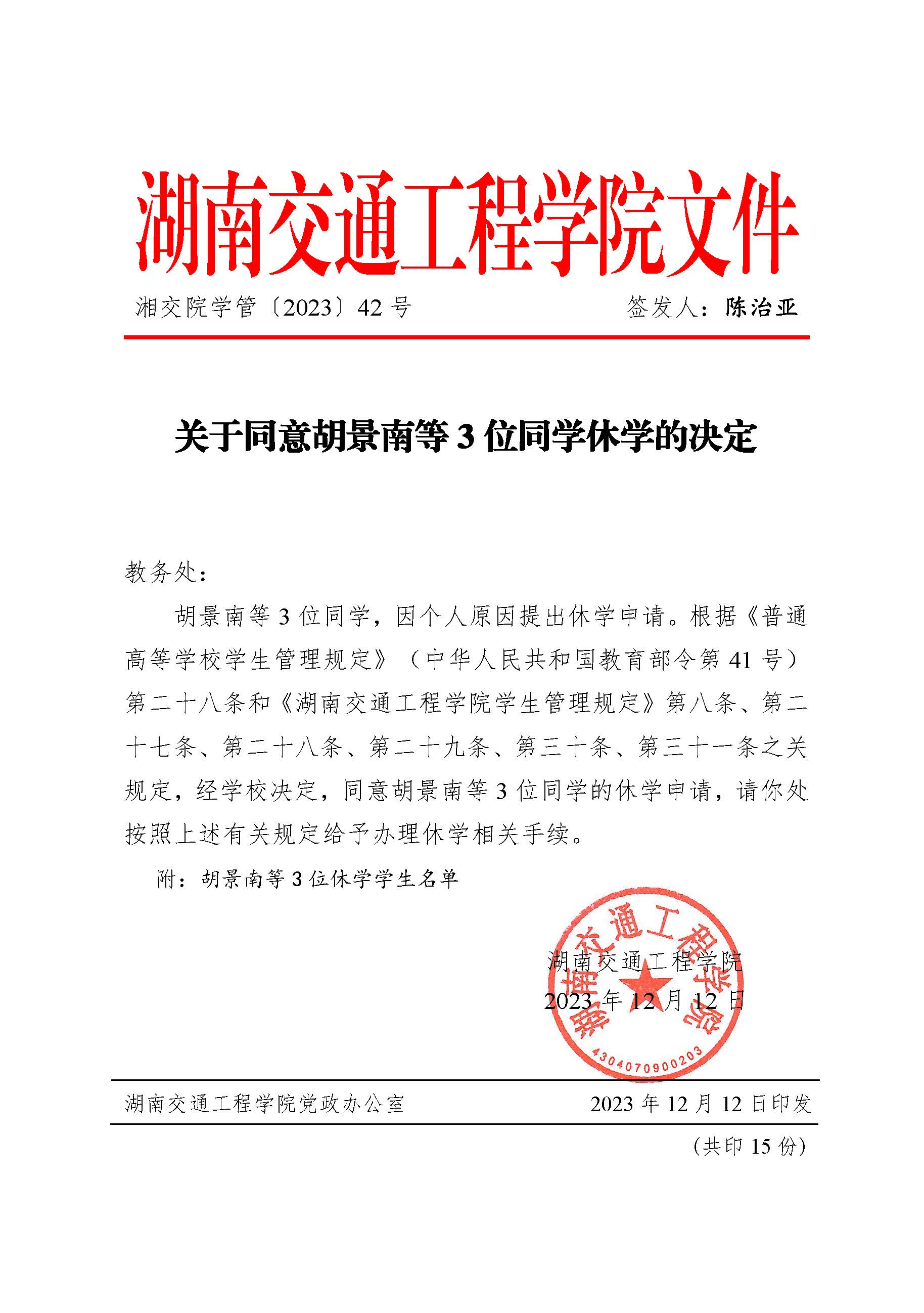 关于同意胡景南等3位同学休学的决定(湘交院学管〔2023〕42号)