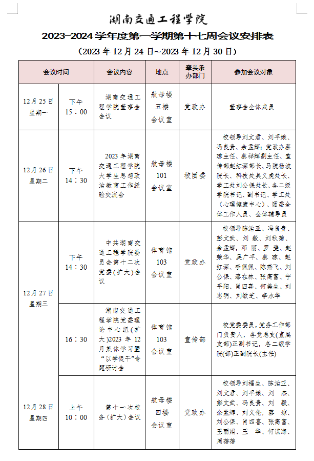 best365中国官方网站2023-2024学年度第一学期第十七周会议安排表