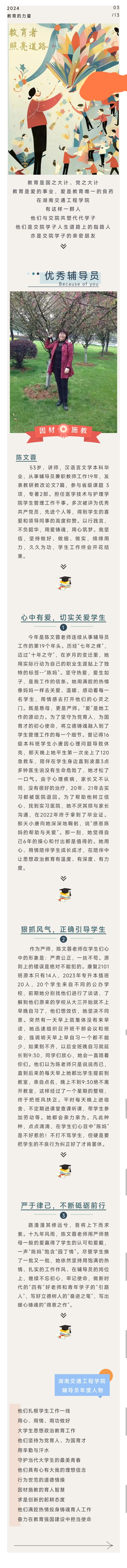 53岁,讲师,汉语言文学本科毕业,从事辅导员兼职教师工作19年,发表教研教改论文7篇,参与省级课题 3项,专著2部。担任医学技术与护理学院学生管理工作干事。多次被评为优秀共产党员,先进个人等,得到学生的喜爱和领导同事的高度称赞。以行践言,不负韶华,用爱铸魂,用心筑梦。我坚信,坚持做好、做细、做实,绵绵用力,久久为功,学生工作终会开花结果。