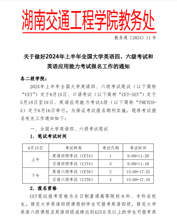 关于做好2024年上半年全国大学生英语四六级考试报名工作的通知