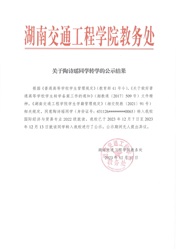 关于陶诗瑶同学转学申请的公示结果
