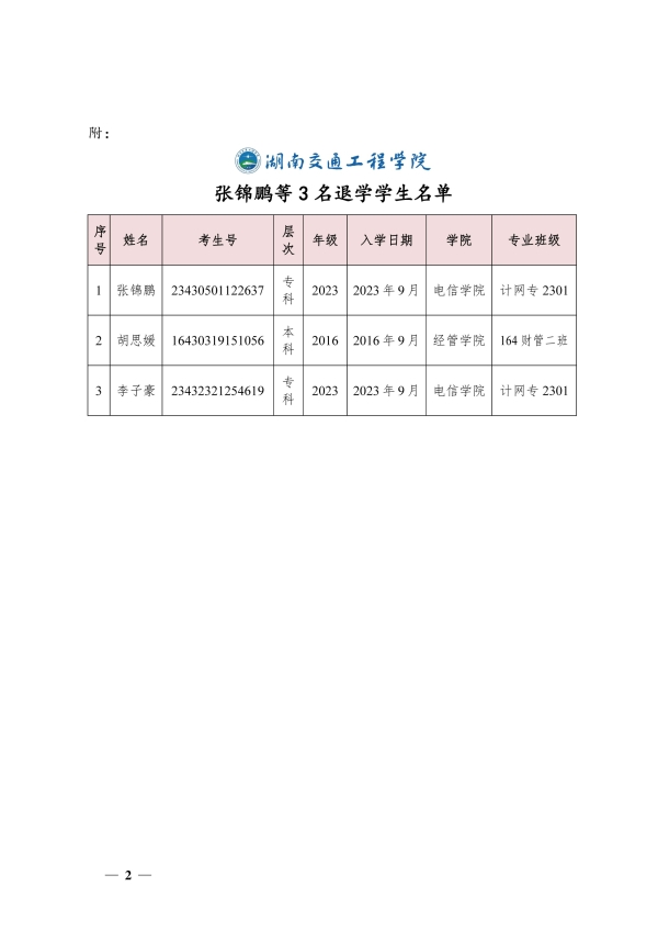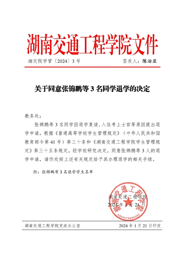 关于同意张锦鹏等3名同学退学的决定(湘交院学管〔2024〕3号)