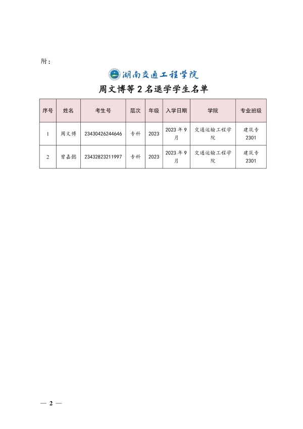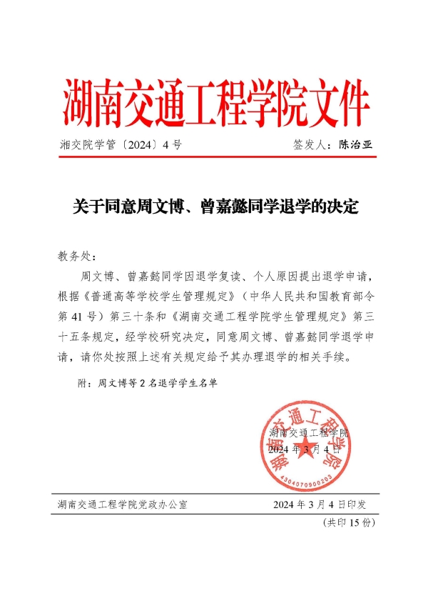 关于同意周文博、曾嘉懿同学退学的决定(湘交院学管〔2024〕4号)