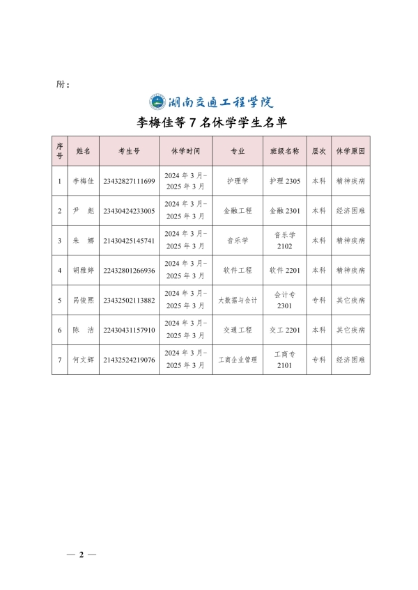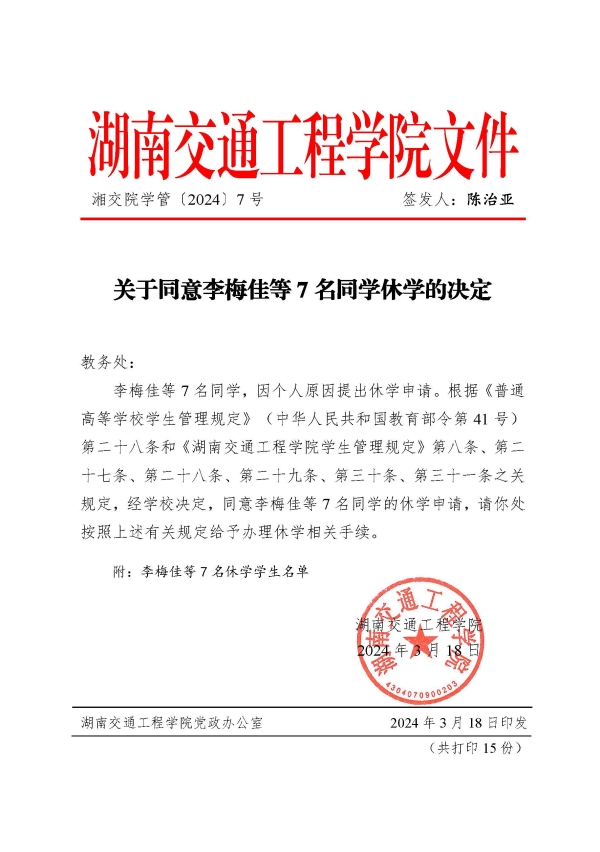 关于同意李梅佳等7名同学休学的决定(湘交院学管〔2024〕7号)