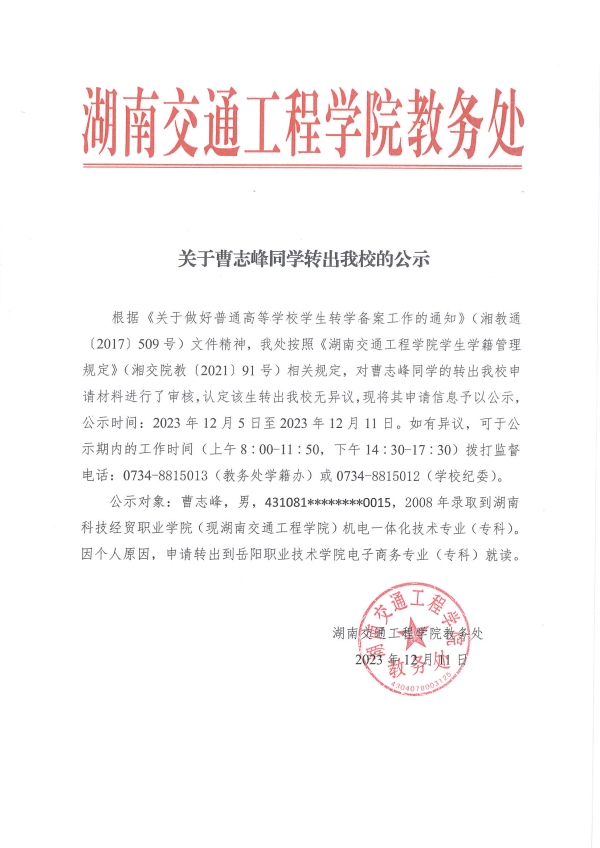 关于曹志峰同学转出best365官网的公示