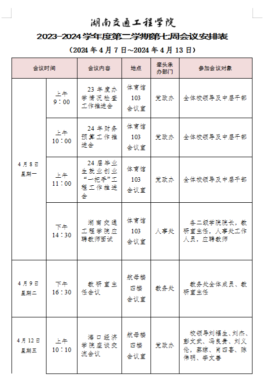 best365中国官方网站2023-2024学年度第二学期第七周会议安排表