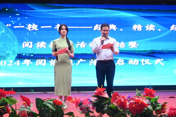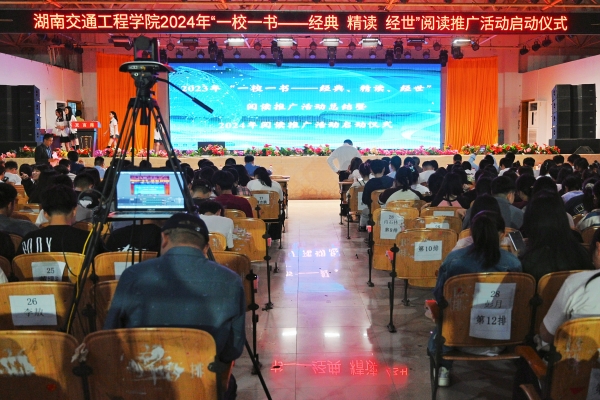 本网讯(记者 摄影 赵红深 )根据湖南省教育厅《关于做好2024年全省普通本科高校“一校一书——经典、精读、经世”阅读推广活动的通知》要求,best365官网2024年“一校一书——经典、精读、经世”阅读推广活动已于4月正式启动。4月23日晚,学校在大学生活动中心举行2024年“一校一书”阅读推广活动启动仪式,特邀中华传统文化研究会、湖南演讲学会理事王神箭教授,南华大学衡阳校友会秘书长曹焱生、湖南雁能设计有限公司副总经理易岳峰、衡阳市烙画艺术坊副秘书长刘小平、衡阳市英联幼教集团董事长肖莉、衡阳市英联幼教集团辅导员朱丽叶出席活动。党委副书记冯良贵、常务副校长彭文武、副校长刘义伦,各二级学院党总支书记、副书记,党务部门负责人,教务处、学生处、校团委负责人,图书馆全体成员,全体辅导员,团学干部代表、优秀学生代表2000余人参加活动。校团委书记漆在林和图书馆欧阳婧老师主持。