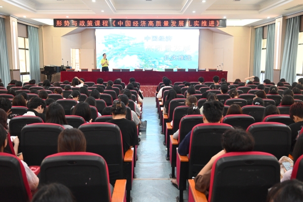 本网讯(通讯员 摄影 赵红深)4月28日上午,校党委书记刘文君在航母楼101会议室以“中国经济高质量发展扎实推进”为题,为2023级护理专业200余名学生讲授形势与政策课。