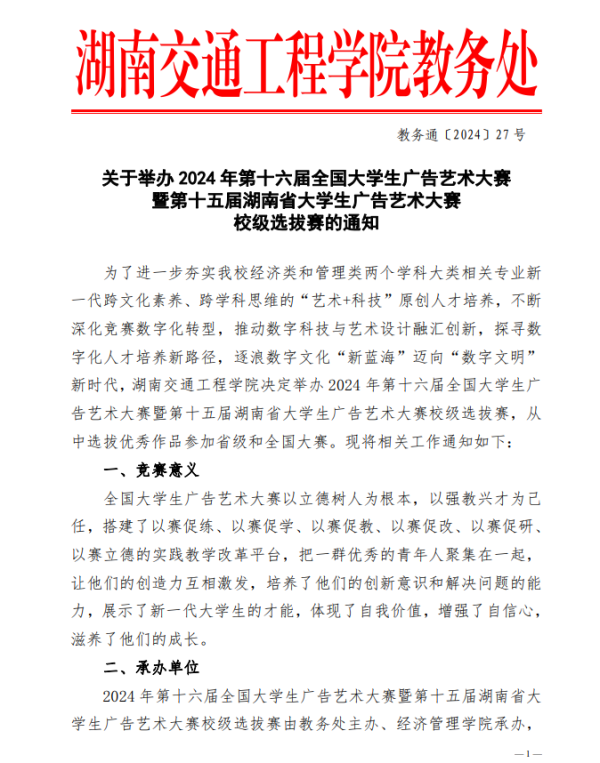 关于举办2024年第十六届全国大学生广告艺术大赛 暨第十五届湖南省大学生广告艺术大赛校级选拨赛的通知