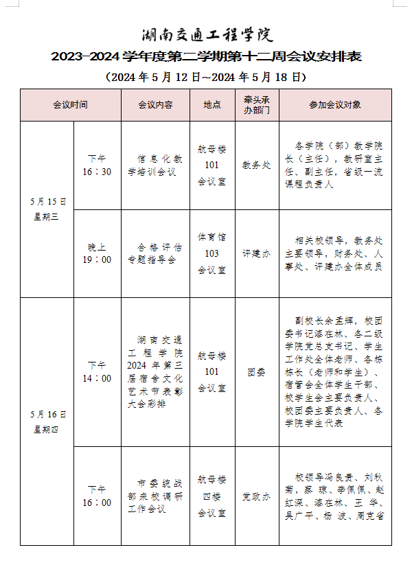 best365中国官方网站2023-2024学年度第二学期第十二周会议安排表