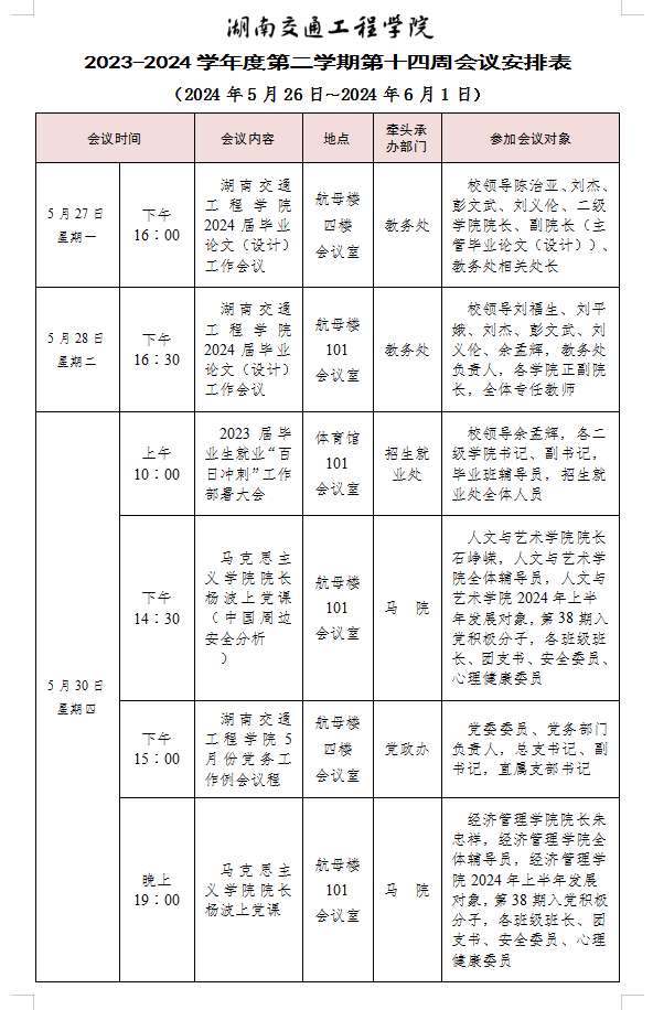 best365中国官方网站2023-2024学年度第二学期第十四周会议安排表