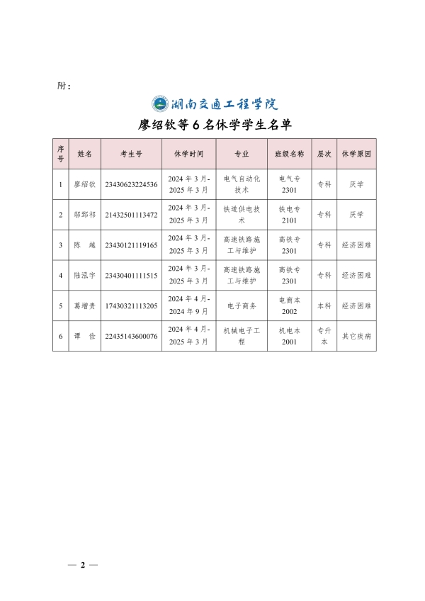 关于同意廖绍钦等6名同学休学的决定(湘交院学管〔2024〕12号)
