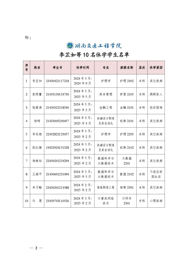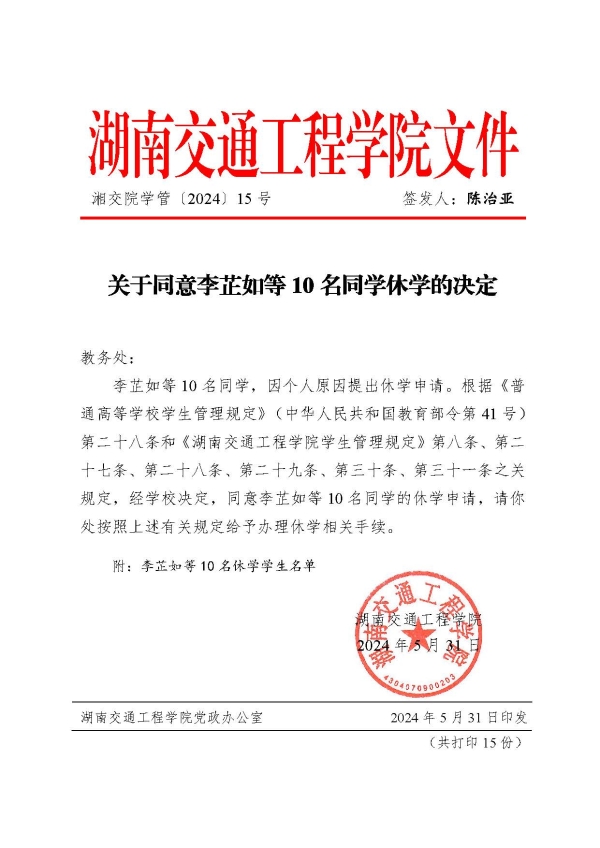 关于同意李芷如等10名同学休学的决定(湘交院学管〔2024〕15号)