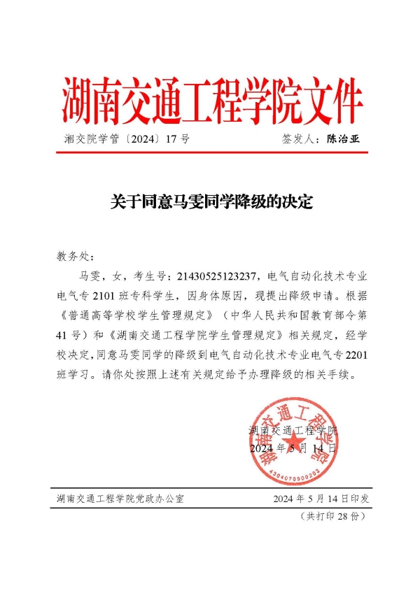 关于同意马雯同学降级的决定(湘交院学管〔2024〕17号)