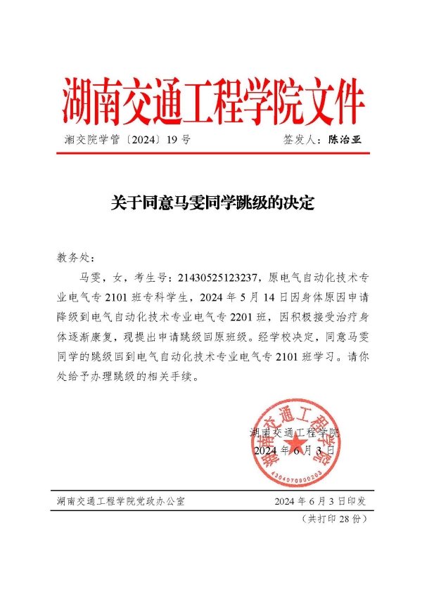 关于同意马雯同学跳级的决定(湘交院学管〔2024〕19号)