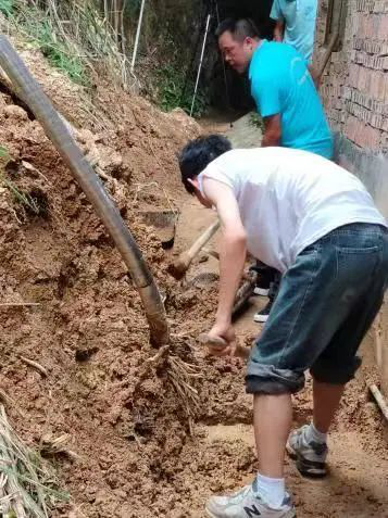 随后,在汤赞等三位老师的带领下,乡村振兴团团队志愿者们带着坚定的信念和充足的干劲,投身于清淤重建的工作中,利用铁锹、扫帚、拖车等工具,对受暴雨影响引发的山体滑坡、泥沙淤积的合作社房屋后面进行清理。