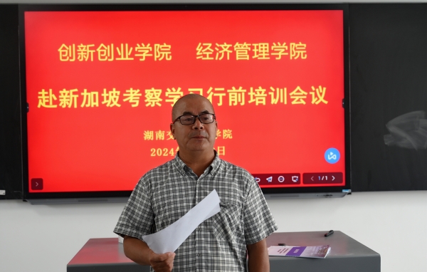 本网讯(记者 摄影 赵红深)8月12日上午,学校组织2024年经济管理学院、创新创业学院教师赴新加坡考察培训团全体参训人员在教学楼306会议室召开行前教育会。湖南省教育国际交流协会秘书处高等教育项目部副主任 鲁雯到会指导并对考察培训团成员进行出国培训行前教育。会议由经管学院院长、此次考察培训团团长朱忠祥主持。