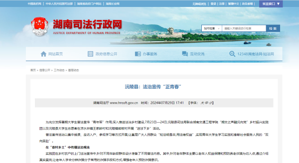 湖南省司法厅官网首页“基层动态”栏目以《沅陵县:法治宣传“正青春”》为题,报道best365官网“湘交之声,融沅向党”乡村振兴实践团参与2024年全国大学生“送法下乡”活动。