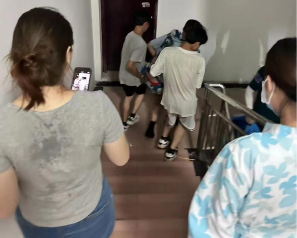 在同学叶轩丞、刘涛、肖明同学热心帮助下,张尹超同学迅速被送往南华附二医院急救室抢救,刘建军老师和三名同学在急救室内陪护了整整一夜,没有休息。由于开学以来的持续高温,医护学院的各位领导及老师高度重视学生身体健康,时刻关注学生身体情况,为每一位新生的身心健康保驾护航。