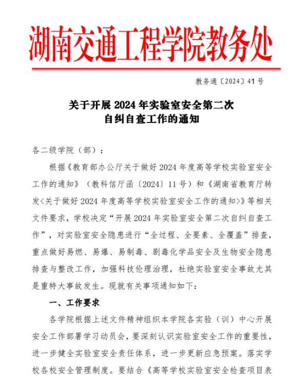 关于开展 2024 年实验室安全第二次 自纠自查工作的通知