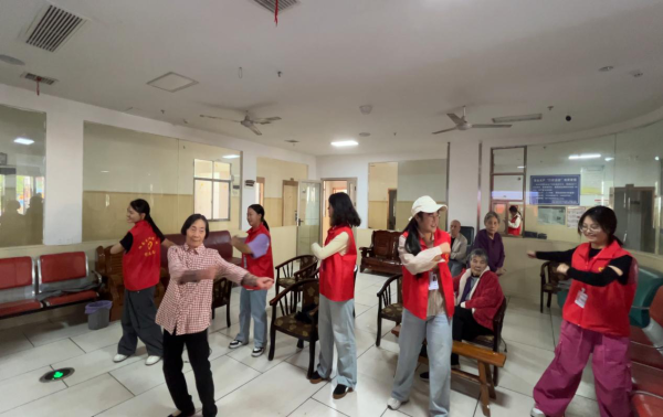 志愿者与老人一起做健康操