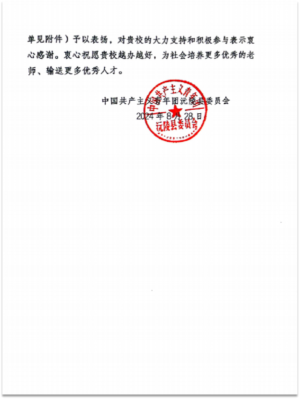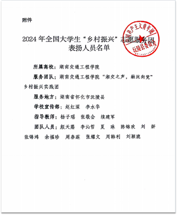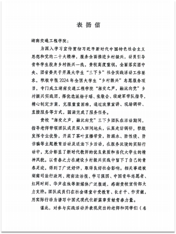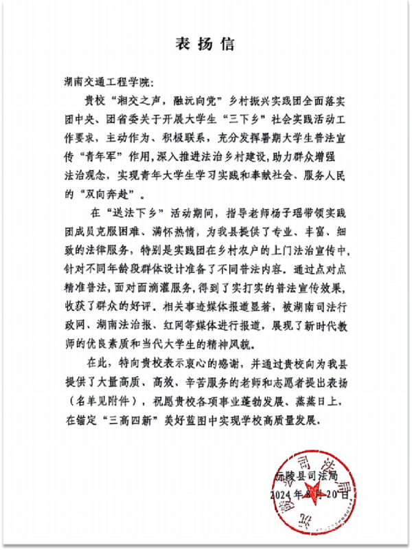 本网讯(通讯员 杨子瑶)近日,best365官网经济管理学院“湘交之声,融沅向党”乡村振兴实践团收到了来自沅陵县司法局和中国共产主义青年团沅陵县委员会等单位的表扬信。信中沅陵县司法局和团县委对团队在暑期三下乡活动中的表现给予高度肯定,表达了对团队成员辛勤工作的真挚谢意。