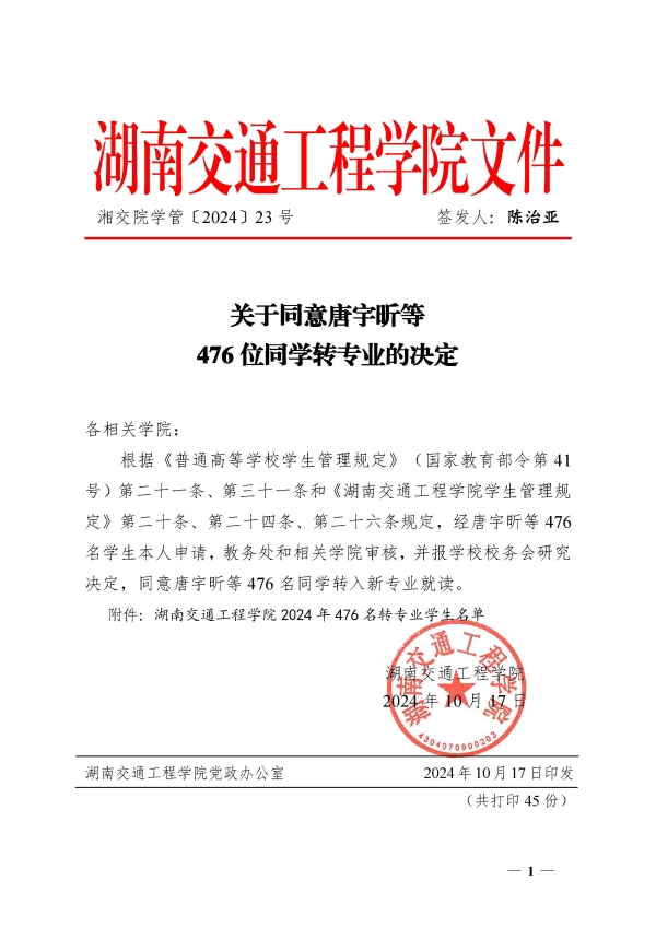 关于同意唐宇昕等476位同学转专业的决定(湘交院学管〔2024〕23号)